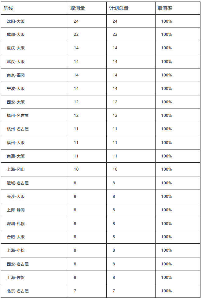 航班管家最新统计显示,2026年1月中国大陆往返日本航班取消量已达2195班次,整体取消率40.4%;其中46条中日航线在未来两周(2025年12月23日—2026年1月5日)内计划航班全部取消,取消率100%,涉及中日双方共38座机场。
